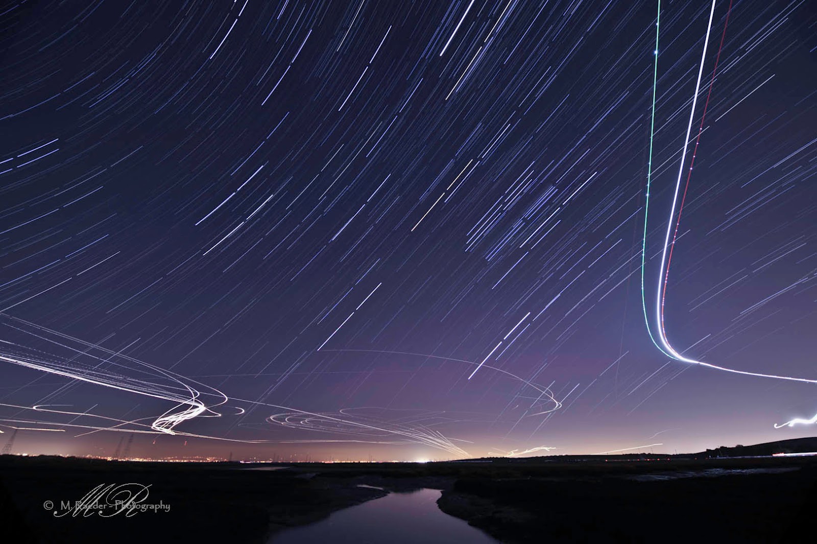 The winter months are excellent for night sky photography since the sun sets early and the twilight is beautiful. The sky is much clearer in the winter without the fog rolling in as is so often the case in the summer months. However, finding ‘dark’ sky not polluted by the city lights can be a challenge. So I spent many cold evenings and nights ‘out there’ capturing the night sky for star trails and time-lapse videos exploring various locations. I found that even over the heavily lit Bay Area one can get interesting images despite the city lights and the heavy airline traffic streaking over the sky.
